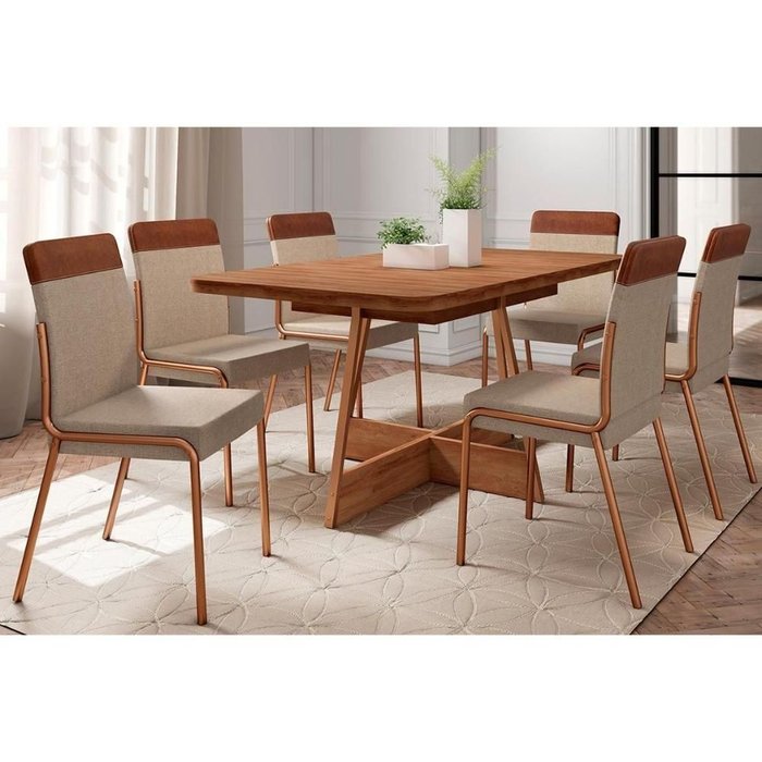 Sala de Jantar Completa Átria 1592 Aço c/ Tampo Madeirado 160x90cm e 6 Cadeiras Duo Rose/Freijo/Nogal - Rose/Areia - Caramelo - Carraro