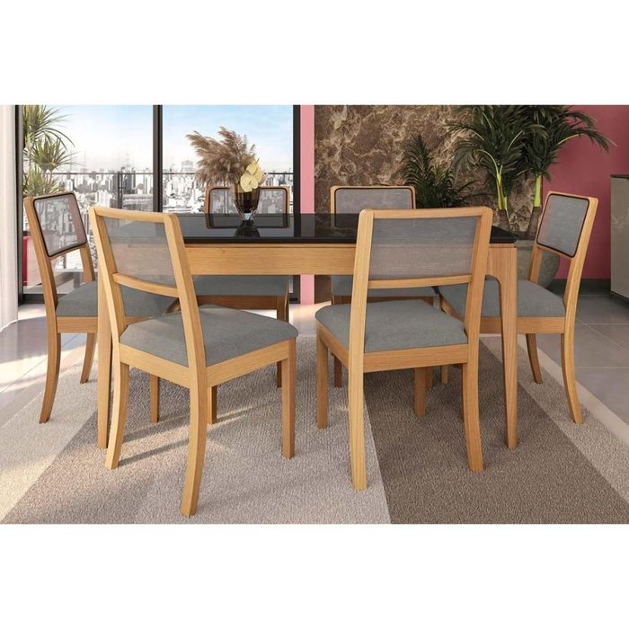 Sala de Jantar Completa Mira Tampo Madeirado c/ Vidro 90x160cm e 6 Cadeiras Lola Carvalho/Preto fosco/Vidro preto - Linho Cinza - Kappesberg