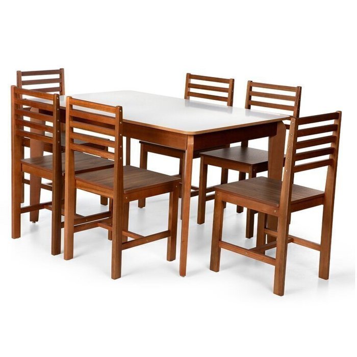 Conjunto Mesa de Jantar Camile 135x80 Cm e 6 Cadeiras Assento Mdf – Madeira Maciça Branco/Amadeirado