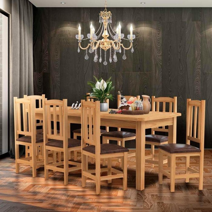 Este conjunto de mesa com cadeiras apresenta uma mesa robusta com estrutura e pés em madeira maciça, combinada com um tampo em MDP. As cadeiras são feitas 100% em madeira maciça, com assento estofado, e entregues montadas para maior comodidade, e cada uma suporta até 120kg. O design clássico e resistente torna-o ideal para diversas configurações de refeições.Especificações da mesa- Estrutura e pés em madeira maciça de Pinus (madeira reflorestada)- 4 pés resistentes- Design robusto e clássico- Tampo em MDPEspecificações das cadeiras- 100% madeira maciça de Pinus (madeira reflorestada)- Possuem assento estofado com revestimento em corino- Cadeiras são entregues montadas para maior comodidade- Cada cadeira suporta até 120kgDimensões da mesa: Largura 200 cm; Profundidade 88 cm; Altura 81 cm.Dimensões das cadeiras: Largura 38 cm; Profundidade 39 cm; Altura 100 cm.Itens inclusos: 1 mesa e 8 cadeirasComplexidade da montagem: Média, pode ser montado por apenas uma pessoa e/ou necessite de maior conhecimento para montagem.Recomendações de uso, manutenção e limpeza: Limpar com flanela ou pano macio seco, não utilizar produtos abrasivos, desengordurantes, álcool ou solvente. Não expor o produto diretamente a luz solar e à umidadeGarantia: 3 mesesOBS: Foto meramente ilustrativa, objetos, utensílios e decoração não fazem parte do produto.