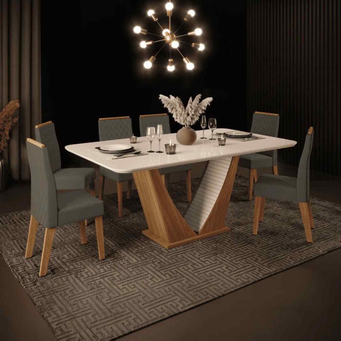 Conjunto Mesa de Jantar Lucy Carvalho/Creme com 6 Cadeiras Cássia Suede Cinza