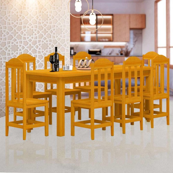 Dimensões da mesa: Largura 200cm; Altura 81cm; Comprimento 88cm.Dimensões da Cadeira: Largura 41,3 cm; Comprimento 38,5 cm; Altura 105 cm.Material: Madeira MaciçaItens Inclusos: 1 mesa e 8 cadeiras- 100% madeira maciça- Design clássico e robusto- Combina com qualquer tipo de ambienteRecomendações de uso, manutenção e limpeza: Limpar com flanela ou pano macio seco, não utilizar produtos abrasivos, desengordurantes, álcool ou solvente. Não expor o produto diretamente a luz solar e à umidadeGarantia: 3 meses