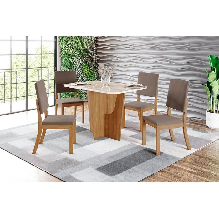 Conjunto Mesa de Jantar Vértice com Vidro e 4 Cadeiras Milla Henn - Nature/Off White/Marrom Amêndoa - Design Moderno e Elegante