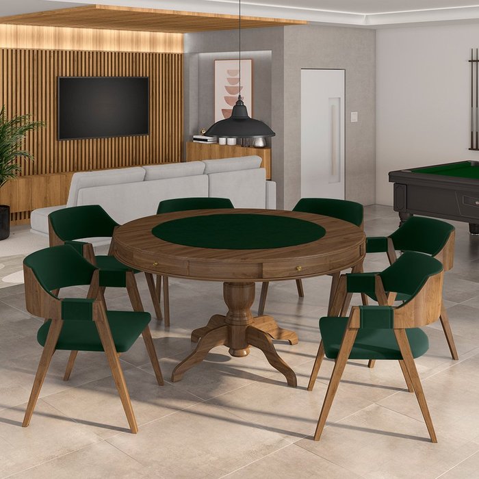 Conjunto Mesa de Jogos Carteado Bellagio Tampo Reversível e 6 Cadeiras Madeira Poker Base Estrela Ve Nogueira