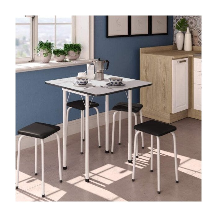 Conjunto de mesa dobrável com 4 mochos empilháveis, lindo e prático para a sua cozinha. A mesa pode ser usada aberta ou fechada, ocupa pouco espaço, os mochos ficam acomodados embaixo da mesa. É a opção ideal para lugares pequenos e aconchegantes.