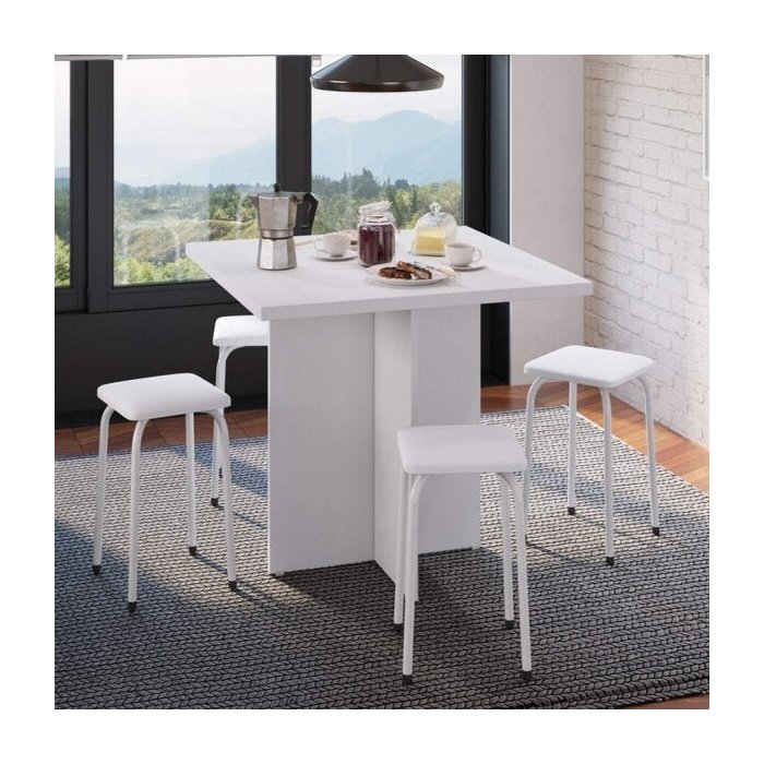 Conjunto de mesa Bona Vita, toda em MDP, com 4 mochos estofados na cor branca, que se encaixam embaixo da mesa, ocupando pouco espaço, ideal para cozinha ou pequenos ambientes. Prática e versátil, era o que faltava para a sua mobília.