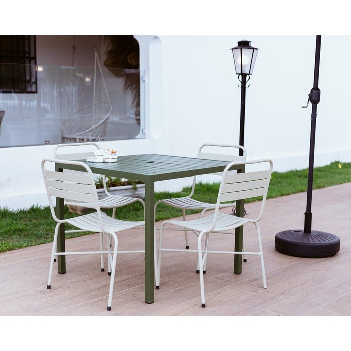 Acompanha: 1 mesa de 100x100 e 4 cadeiras em alumínio