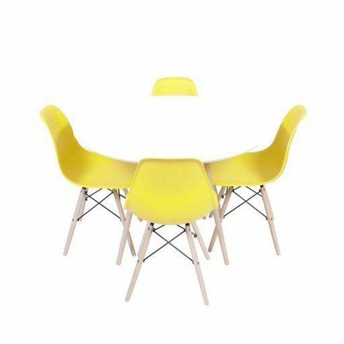 CONJUNTO DE 1 MESA EAMES BRANCA 1,10CM + 4 CADEIRAS EAMES AMARELA DESCRIÇÃO TÉCNICA MESAMaterial: Polipropileno e madeira