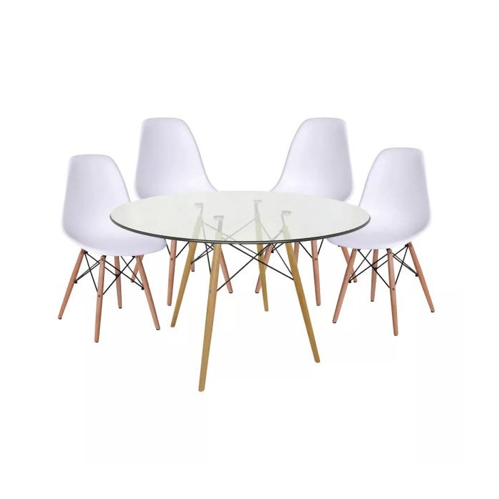 Conjunto Mesa Eiffel de Vidro com a Base Madeira 90cm + 4 Cadeiras Eames Dsw Branca Branco | Vidro
