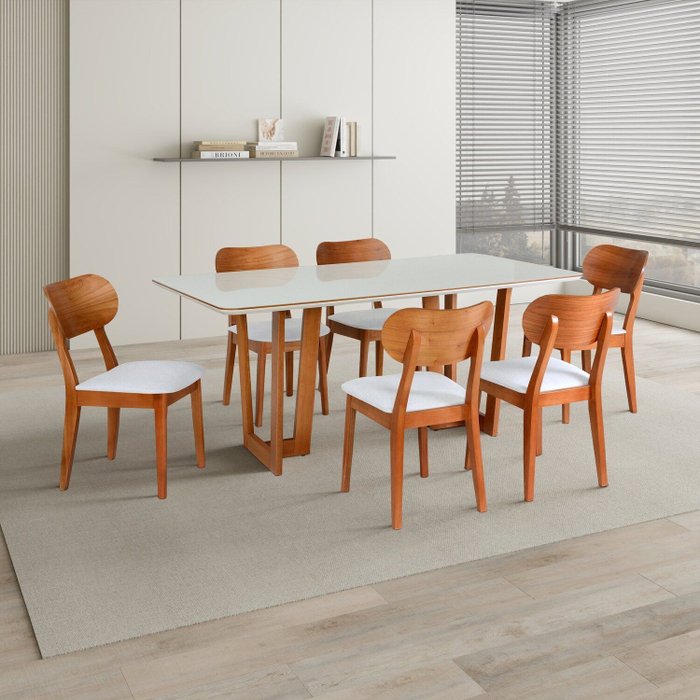 Surreal, não é mesmo? O Conjunto Mesa Grécia com 6 Cadeiras de Madeira Maciça, Multilaminada e Estofada Letícia Authentic traz um toque de elegância e sofisticação na sua sala de jantar, deixando o ambiente muito agradável. Os conjuntos de cadeiras tem sua estrutura 100% em Madeira Maciça, Assento e Encosto estofado Premium em D-16 e D-18 e já vão 100% montadas, facilitando ainda mais. Com acabamento impecável em verniz, tem como essência a robustez e naturalidade ao mesmo tempo. Possui uma estrutura mega resistente e uma durabilidade acima da média. É realmente uma preciosidade em forma de móvel!