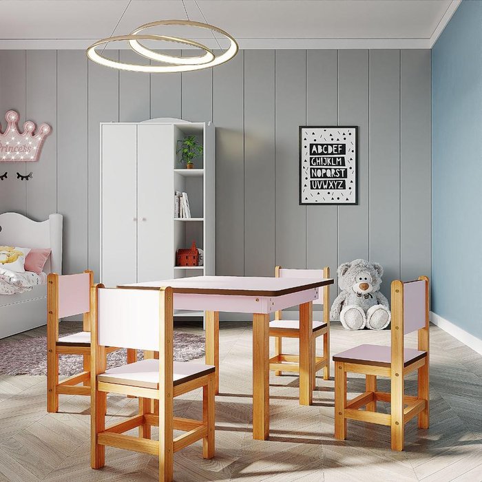 Conjunto Mesa Infantil Gabi 60x60cm com 4 Cadeiras Manu - Rosa Rosa