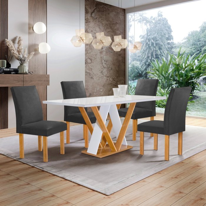 Conjunto Mesa Manuela 120cm com 4 Cadeiras Canela Tampo Dakota Plus com Vidro Yescasa Cinamomo/Off White/Cinza