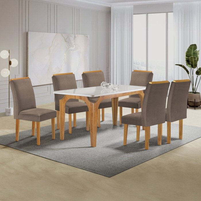 Conjunto Mesa Melina 170cmx90cm com 6 Cadeiras Luisa Tampo Smart Plus com Vidro Cinamomo/Off White/Bege Escuro