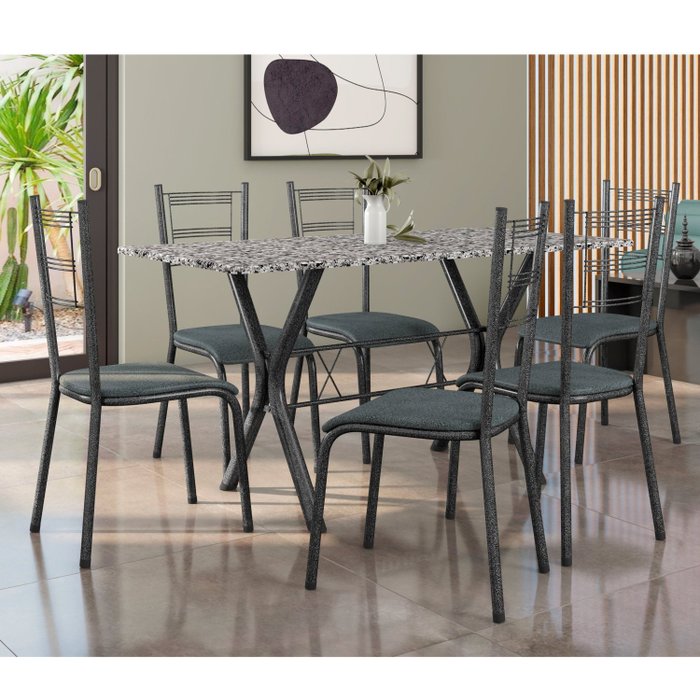 Conjunto Mesa Miami 150cm Granito 6 cadeiras Santiago Assento Courino Preto/Prata/Mesclado Petróleo