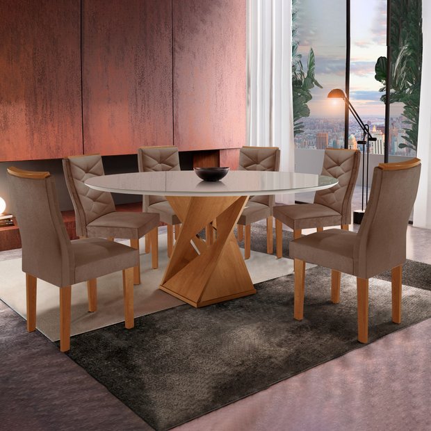 Conjunto Mesa Redonda com Vidro e 6 Cadeiras Tampo 120cmx120cm Barcelona Yescasa Cinamomo/Off White/Suede Animale