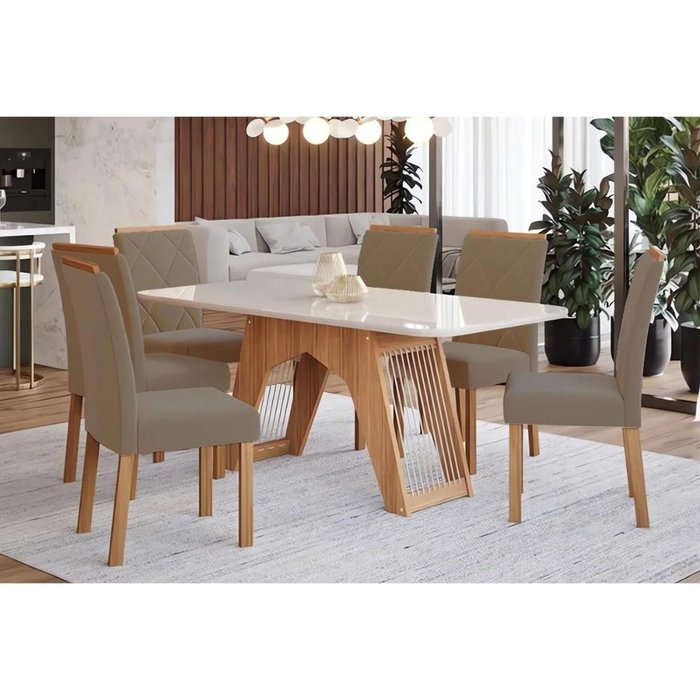 Conjunto: Mesa Sala Jantar Carol Tampo Madeirado C/ Vidro 180x90cm e 6 Cadeiras Fernanda Madeirado/ Nature/Off White