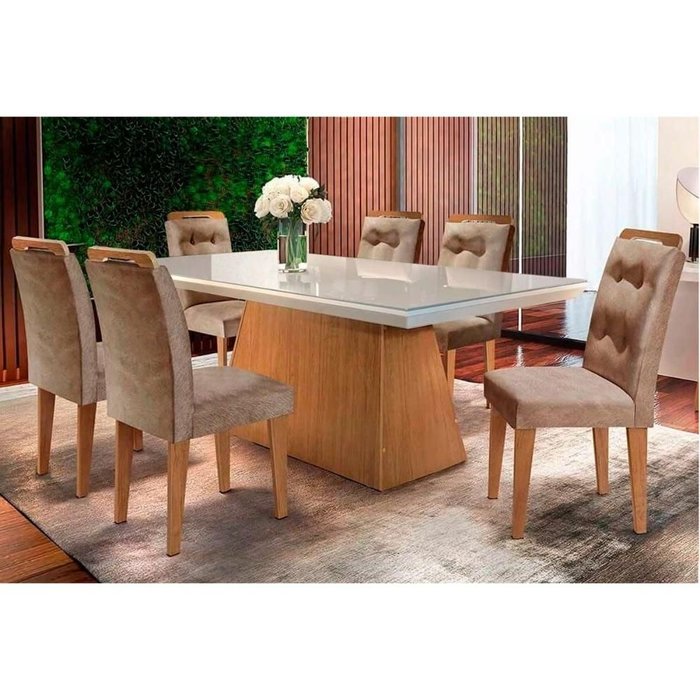 Sala de Jantar Completa Luna c/ Tampo de Vidro Canto Curvo 180x90cm e 6 cadeiras Imperatriz Imbuia/Off White - Suede Capuccino - Rufato