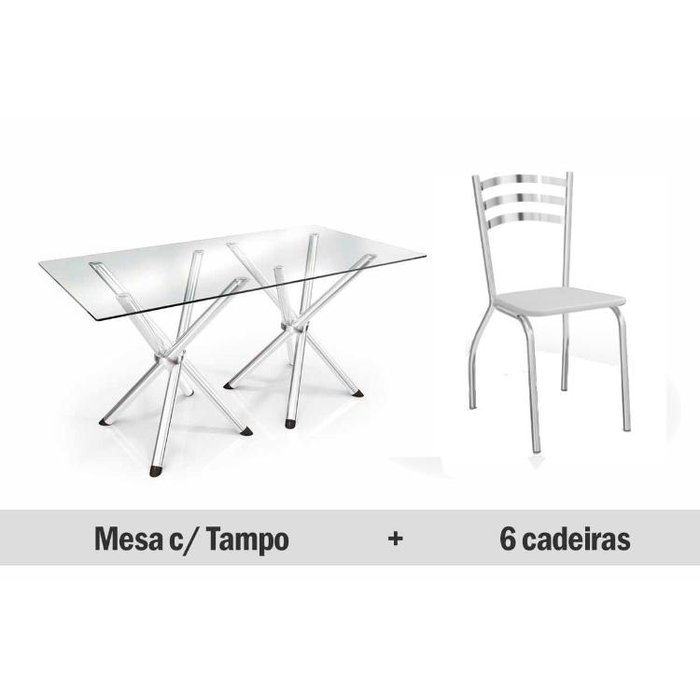 Conjunto: Mesa Sala Jantar Volga c/ Tampo Vidro 150cm + 6 Cadeiras Portugal Cromado/Courano Branco -