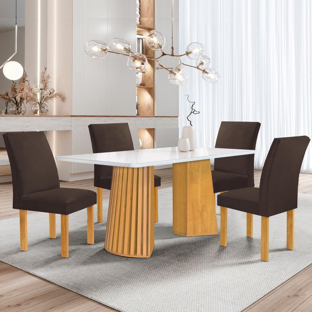 Conjunto Mesa Stella Ripada 120cm com 4 Cadeiras Canela Tampo Smart Plus com Vidro Cinamomo/Off White/Veludo Marrom