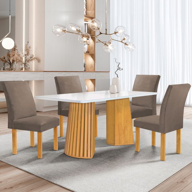 Conjunto Mesa Stella Ripada 120cm com 4 Cadeiras Canela Tampo Smart Plus com Vidro Cinamomo/Off White/Areia