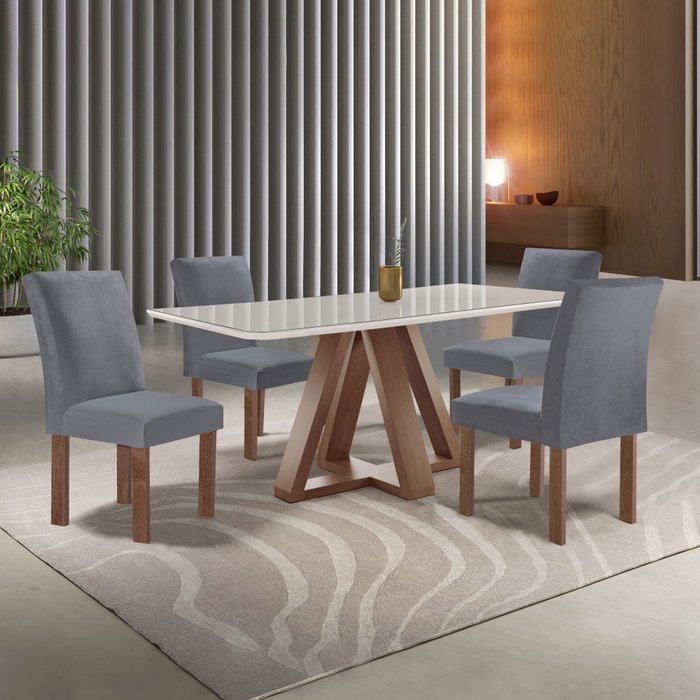 Conjunto Mesa Tampo Smart Plus Vidro Kyra 120cmx90cm 4 Cadeiras Canela Chocolate/Off White/Suede Cinza
