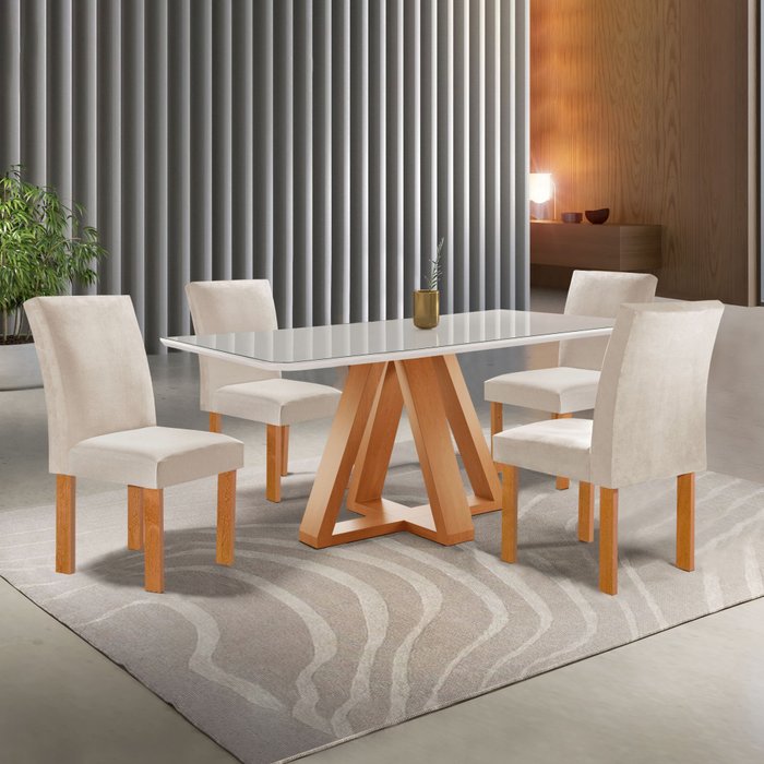 Conjunto Mesa Tampo Smart Plus Vidro Kyra 120cmx90cm 4 Cadeiras Canela Cinamomo/Off White/Suede Bege