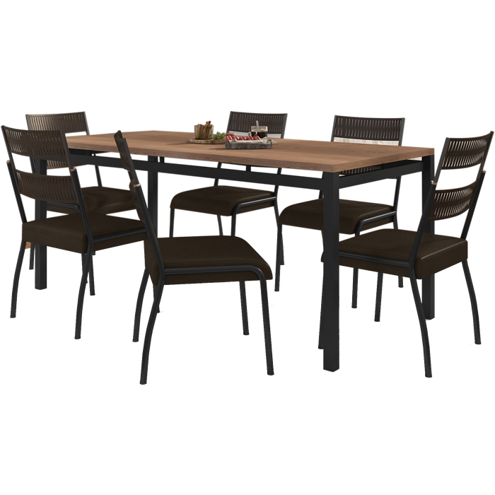 Conjunto Mesa Valência 1,70x0,80- 6 Cadeiras Atenas Preto Fosco com Assento Marrom Escuro