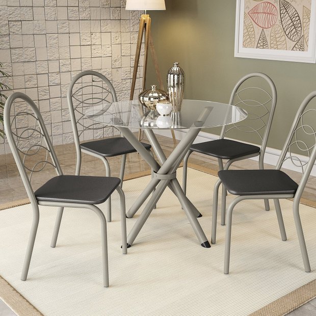 Para ambientes modernos, o conjunto CMC683 da Kappesberg é a melhor opção. Em estrutura metálica pintada com tinta epóxi na cor níquel, a mesa possui um design único, com destaque para a disposição dos pés, unidos por um anel central. Medindo 75cm de altura e 73cm de largura e profundidade, combinada ao tampo de vidro redondo e transparente TAV9561, com 6mm de espessura, ela acomoda até quatro pessoas. Já as cadeiras, no modelo Holanda, também em estrutura metálica pintada na cor níquel, medindo 91,8cm de altura, sendo 46cm a altura do assento, suportam até 130kg, garantindo estabilidade e resistência. E para mais comodidade, o assento é estofado e recoberto em corino na cor preta. Já o encosto, enclinado, conta com detalhes em aramado, que proporcionam um melhor acabamento e conforto.
