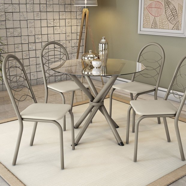 Para ambientes modernos, o conjunto CMC683 da Kappesberg é a melhor opção. Em estrutura metálica pintada com tinta epóxi na cor níquel, a mesa possui um design único, com destaque para a disposição dos pés, unidos por um anel central. Medindo 75cm de altura e 73cm de largura e profundidade, combinada ao tampo de vidro redondo e transparente TAV9561, com 6mm de espessura, ela acomoda até quatro pessoas. Já as cadeiras, no modelo Holanda, também em estrutura metálica pintada na cor níquel, medindo 91,8cm de altura, sendo 46cm a altura do assento, suportam até 130kg, garantindo estabilidade e resistência. E para mais comodidade, o assento é estofado e recoberto em corino na cor nude. Já o encosto, enclinado, conta com detalhes em aramado, que proporcionam um melhor acabamento e conforto.