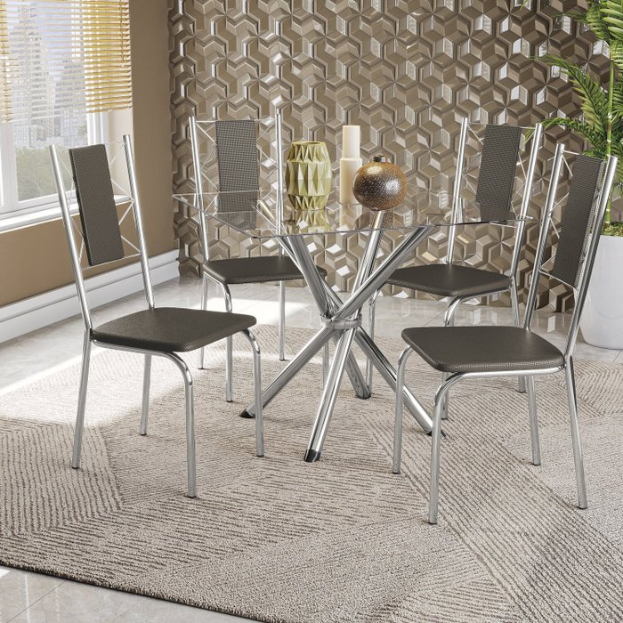 Conjunto Mesa Volga Tampo de Vidro e 4 Cadeiras Lisboa Cromado/Marrom