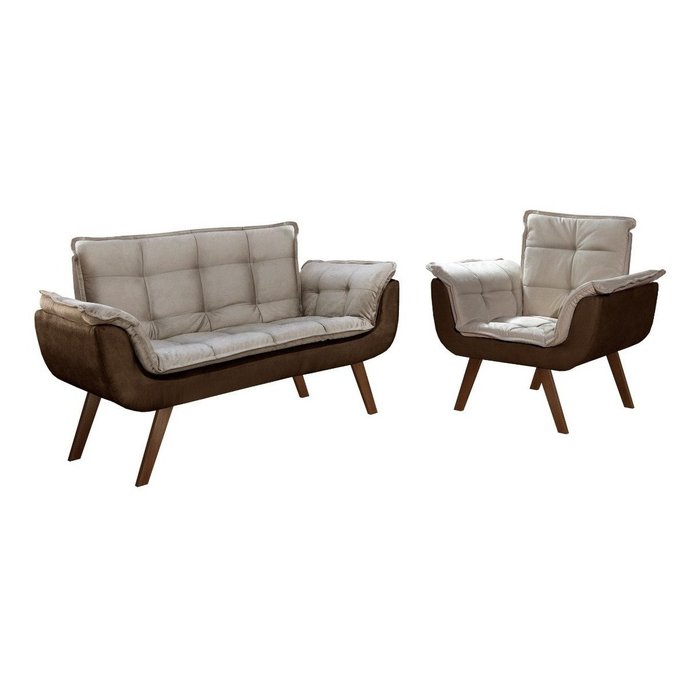 Conjunto Namoradeira + Poltrona Bella Opala Pé Madeira Decoração Sala - Veludo Marrom com Capuccino