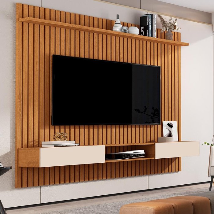 Esse Conjunto é perfeito para deixar sua sala linda e organizada. O nicho é completo para guardar seus acessórios de sala e tambem conta com uma prateleira. O painel é um produto perfeito, para o seu ambiente ter mais modernidade e praticidade, possui um design elegante com os seus detalhes ripados em alto relevo, testado para suportar TVs de até 60 polegadas. Conta com uma prateleira para acomodar os objetos decorativos, plantas, livros , videogames e aparelhos de TV. Dimensões do Painel: Altura: 183 cm Largura: 185,5 cm Profundidade: 20,5 cm Informações do Painel: Cor: Nature Material Principal: MDP Suporta TVs de até 60 Polegadas Pintura UV Prateleira: Sim (1) Passa Fio: Sim (1) Acabamento ripado em alto relevo. Dimensões do Nicho: Altura: 15,5 cm Largura: 178 cm Profundidade: 32 cm Informações do Nicho: Cor: Nature/Off White Portas: Sim (2) com drobadiças metálicas. Prateleira: Sim (1). Nicho: Sim (1). Itens Inclusos: 1 Painel 1 Nicho Manual de Montagem Kit completo para montagem e manual de instruções Garantia: 3 meses contra defeito de fabricação Informações Adicionais: - Fotos meramente ilustrativas do produto no ambiente. - Os objetos que ambientam as fotos não acompanham o produto; - Verificar descrição e tamanho do produto antes da compra. - Avaliar a mercadoria no ato do recebimento e recuse em caso de divergência ou avarias. - Mantenha as informações de contato e endereço de entrega atualizados para entrarmos em contato caso necessário. - Limpar com flanela ou pano macio seco, não utilizar produtos abrasivos, desengordurantes, álcool ou solvente. Não expor o produto diretamente à luz solar e à umidade. * Sugerimos a contratação de um montador profissional para a montagem do produto. Não nos responsabilizamos por avarias causadas no ato da montagem. * Não nos responsabilizamos pela montagem e desmontagem do produto no ato da entrega e devolução, assim como os custos gerados nestas situações. * A transportadora entregará o produto no andar térreo do endereço de entrega. * Não nos responsabilizamos por subir escadas, corredores e elevadores ou transporte por guincho em apartamentos.
