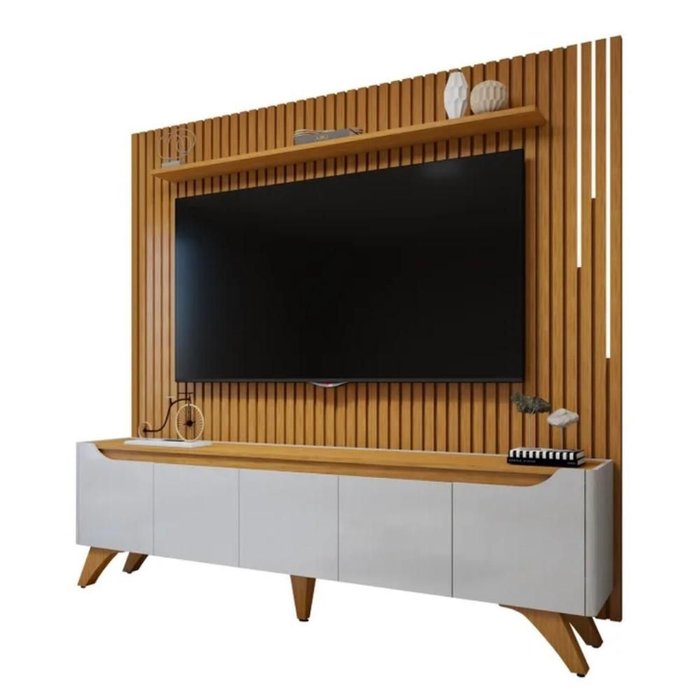 Conjunto Painel Ripado para TV até 75 Polegadas e Rack Paris com LED Off White Naturalle Transforme seu ambiente com nosso conjunto de móveis para sala de estar! O painel ripado traz um toque moderno e estiloso para destacar sua TV, enquanto a prateleira oferece aquele espaço extra perfeito para expor suas decorações favoritas. Já o rack, com seu design elegante, oferece um amplo espaço de armazenamento para organizar seus eletrônicos, decorações e muito mais, além de ser o complemento ideal para uma sala cheia de personalidade. Praticidade e sofisticação em um só conjunto para deixar sua sala incrível! Especificações - Medidas do produto montado: 250 (A) x 228 (L) x 37 (P) cm; - Medidas do painel: 250 (A) x 228 (L) x 19 (P) cm; - Medidas do rack: 60,5 (A) x 220 (L) x 37 (P) cm; - Cor: Off White e Naturalle; - Material: MDF; - Painel ripado; - Ideal para TVs até 75 poelgadas; - Possui porta: 4; - Porta tipo bater; - Possui prateleira: 1; - Possui gaveta: 1; - Gaveta com corrediças telescópicas; - Possui pé: 4; - Pés em madeira maciça; - Painel com LED; - Necessita Montagem: Sim; - Complexidade da Montagem Média: pode ser montado por mais de uma pessoa e/ou necessite de maior conhecimento para montagem; - Sistema de Montagem Parafusos e Minifix; - Peso do produto: 127 kg.