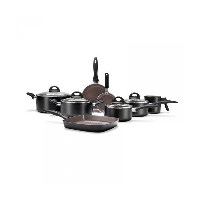 O conjunto de panelas com 8 peças da linha Smart Plus vai deixar a sua cozinha mais completa! Com a nova geração de antiaderente cerâmico: a Pro Ceramic Premium, estão mais resistentes, livres de metais pesados e elementos químicos prejudiciais à saúde, exigem menos óleo e não deixam os alimentos grudarem. Ao cozinharem os alimentos por igual e por serem de fácil limpeza, elas facilitam a rotina na cozinha. Os cabos e alças têm revestimento Soft-Touch, não esquentam e têm um toque macio, e as tampas são de vidro temperado com saída para o vapor. O conjunto é composto por oito peças: duas caçarolas com tampas (24x11 cm e 4,55 litros e 20x9,5 cm e 2,55 litros), duas frigideiras (20x3,5 cm e 0,6 litro e 14x2,5 cm e 0,2 litro), duas panelas com tampa (18x9 cm e 1,55 litro e 16x8 cm e 1,25 litro), um grill (24x22x3 cm e 1,35 litro) e um fervedor (11x12,5 cm e 1 litro). Nesta versão, a cor da pintura externa é preta.
