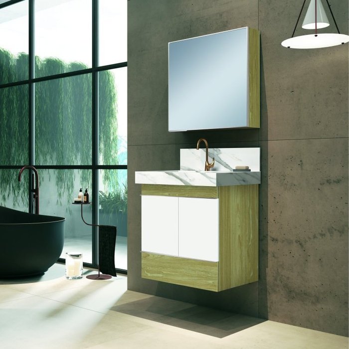 Conjunto para Banheiro 1 Espelheira 1 Gabinete TN 1 Lavatório com Cuba Blu Lavatórios Calacata/Wood