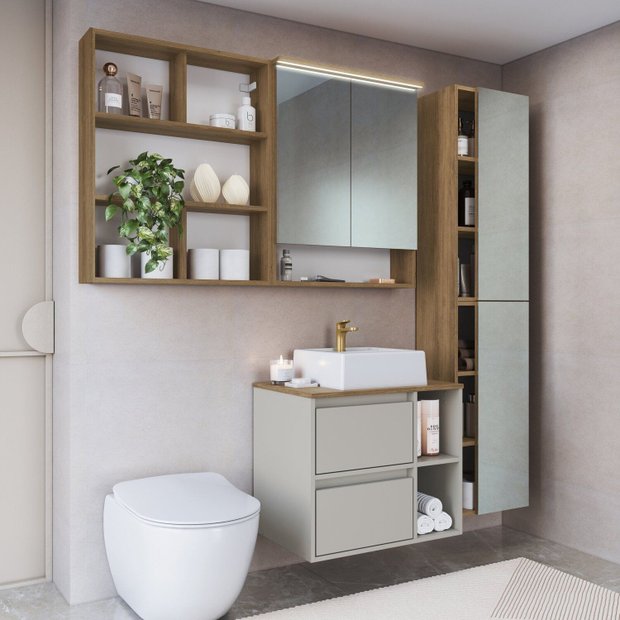 O conjunto para banheiro CB.BN8005 forma um ambiente completo para seu banheiro. Este conjunto conta com balcão com cuba, espelheira com 2 espelhos e luzes led, 1 nicho organizador e mais 2 armários organizadores com espelhos. O conjunto possui design moderno e cria um ambiente prático e organizado ao seu banheiro.