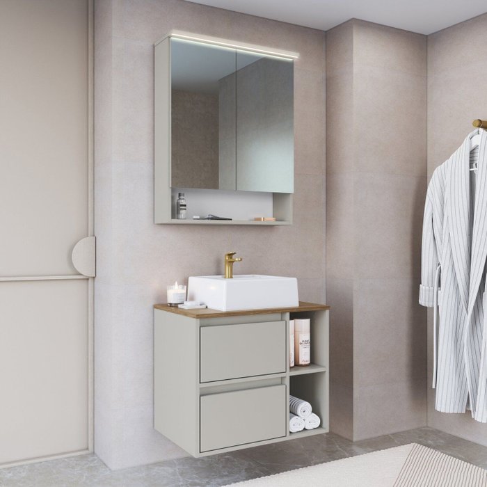 Conjunto para Banheiro Gabinete Suspenso 60cm com Cuba Espelheira com Led Arenas