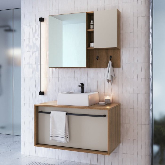 Conjunto para Banheiro Gabinete Suspenso 80cm com Puxador Toalheiro Cuba e Espelheira Cj8040.10 Mel/Arenas