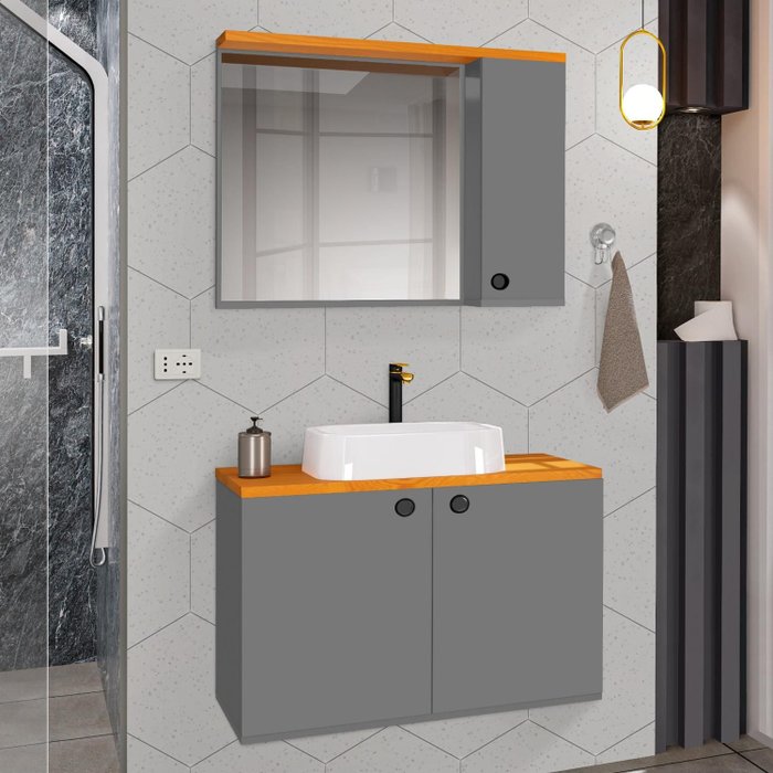 Conjunto para Banheiro Gabinete Suspenso com Cuba e Espelheira Madri Cinza com Nature - Rede Móveis