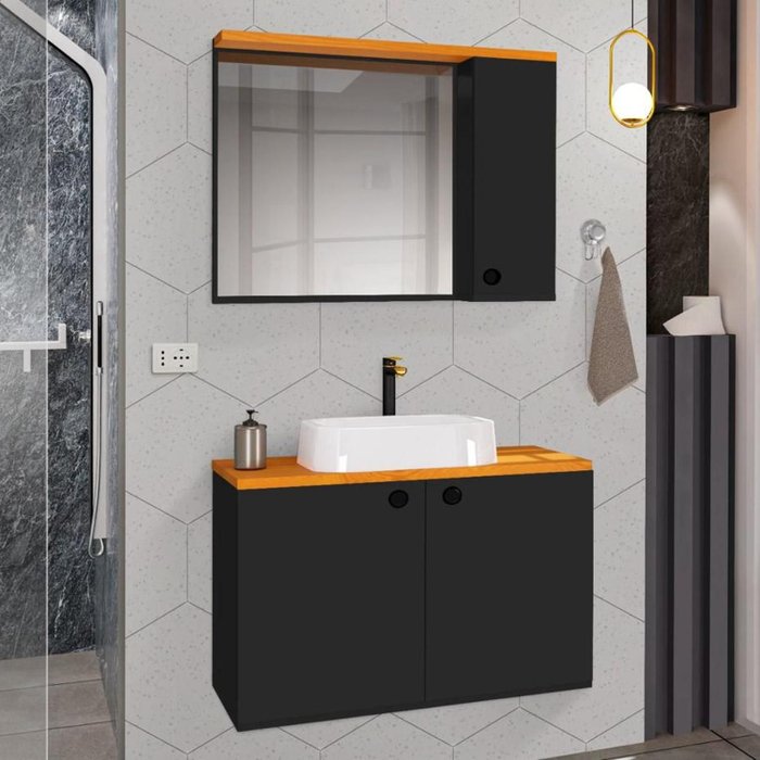 Conjunto para Banheiro Gabinete Suspenso com Cuba e Espelheira Madri Preto com Nature - Rede Móveis
