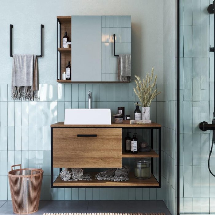 Conjunto para Banheiro Industrial com Gabinete, Cuba e Armário com Espelho - Preto/Mel