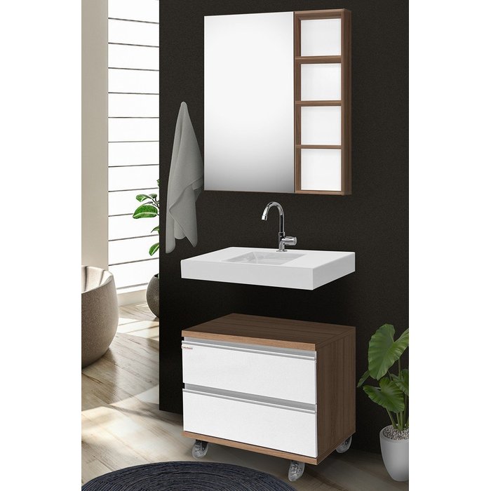 Conjunto para banheiro Jade 60cm- Fabribam Gabinetes Branco/nogal - O conjunto Jade é cheio de estilo, com duas gavetas com corrediça telescópicas que permite a sua abertura total, e rodízio gel incolor, com base cromada e trava na frente. Ideal para contribuir com a organização e decoração do banheiro de forma prática e estilosa. • Medida gabinete: Altura 55cm x Largura 60cm x Profundidade 42cm; • Medida espelheira: Altura 77cm x Largura 65cm x Profundidade 15cm; • Medida lavatório: Altura 12cm x Largura 64cm x Profundidade 42cm; Estrutura 25mm; Puxadores embutidas em perfil de alumínio; Corrediças telescópicas; Rodizio gel incolor com base cromada e trava na frente; Não acompanha torneira, sifão ou demais acessórios para instalação, devem ser compradas separadamente. Nossos produtos já vão montados, sendo necessário somente fixar o lavatório e os pés. Acompanha o produto: Gabinete Espelheira Lavatório jade. Garantia: 12 meses