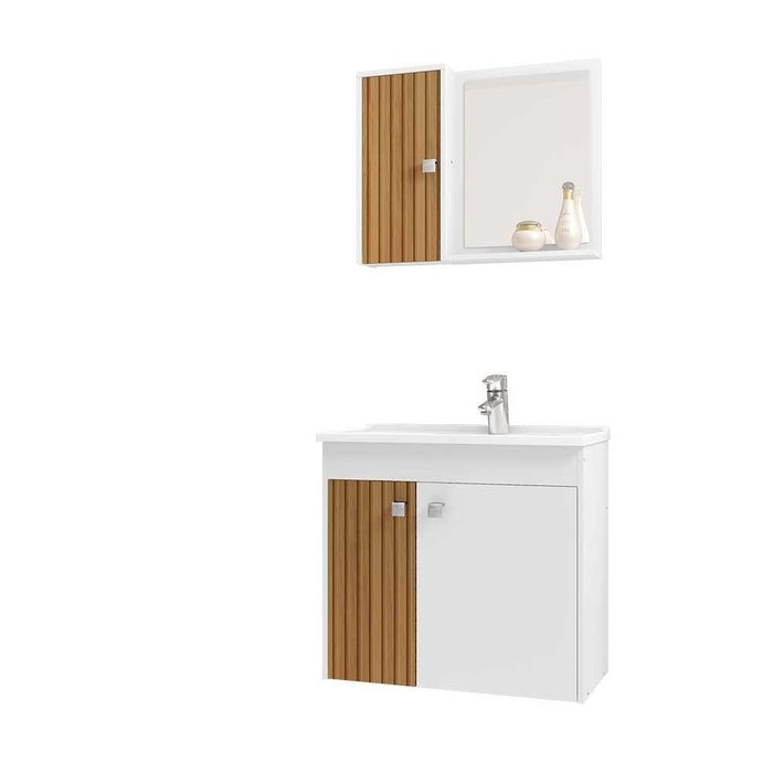 Conjunto para banheiro composto por lavatório em mármore sintético, armário superior, espelheira e gabinete, elaborado em MDF com espessura de 12 mm. Pintura da superfície em verniz poliéster semi-brilho, com secagem UV e impressão a laser, com acabamento com textura em alto relevo, destacando os veios da madeira com cores mais próximas às naturais. Acabamento nas bordas com fita de papel decorativo aplicado mecanicamente por sistema hot melting. Puxadores de plástico com acabamento cromado, dobradiças metálicas.