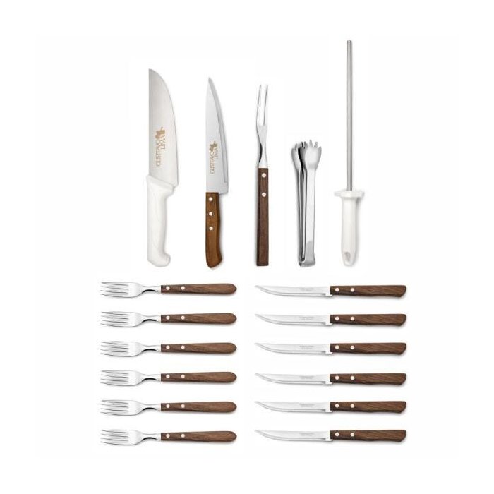 O jogo é composto por 6 Facas e 6 Garfos de mesa, uma Faca Profissional, um Pegador, uma Chaira, uma Faca peixeira, um Garfo Trinchante e uma Tábua para churrasco assinados pelo artista,