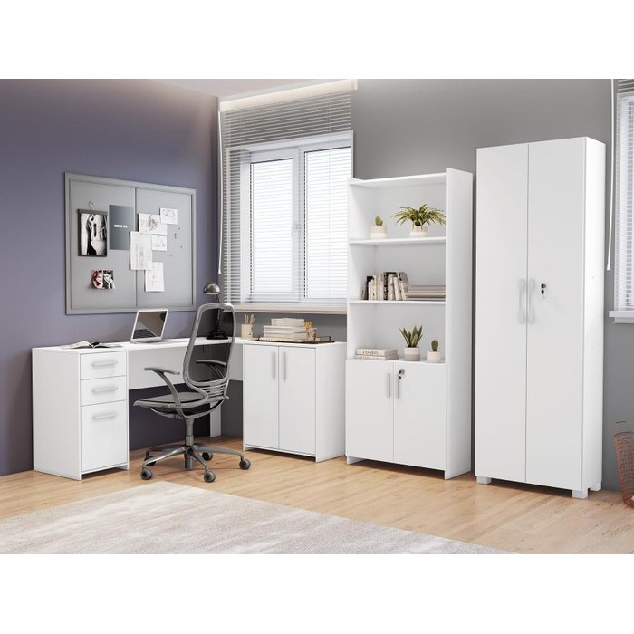 Conjunto Para Escritório 1 Mesa de Canto 2 Armários Altos Branco Notável Móveis
