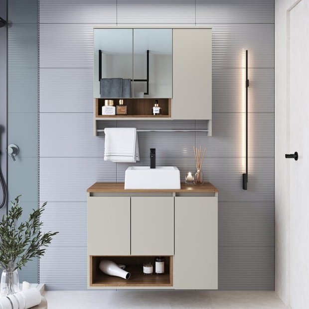 Conjunto para Gabinete Suspenso 80cm com Cuba e Espelheira 3 Portas com Toalheiro e Nicho Olívia Mel/Arenas