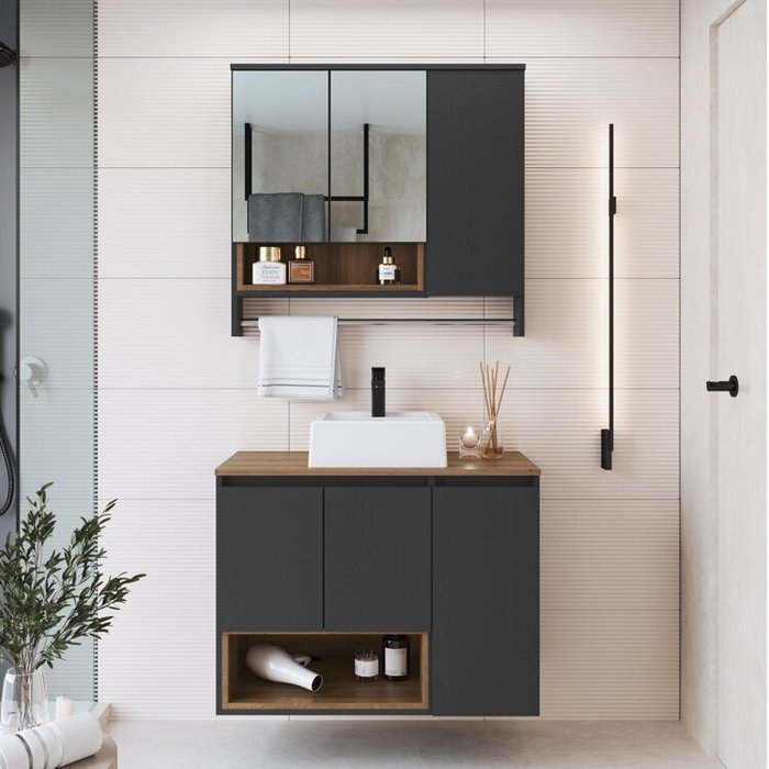 Conjunto para Gabinete Suspenso 80cm com Cuba e Espelheira 3 Portas com Toalheiro e Nicho Olívia Mel/Grafite