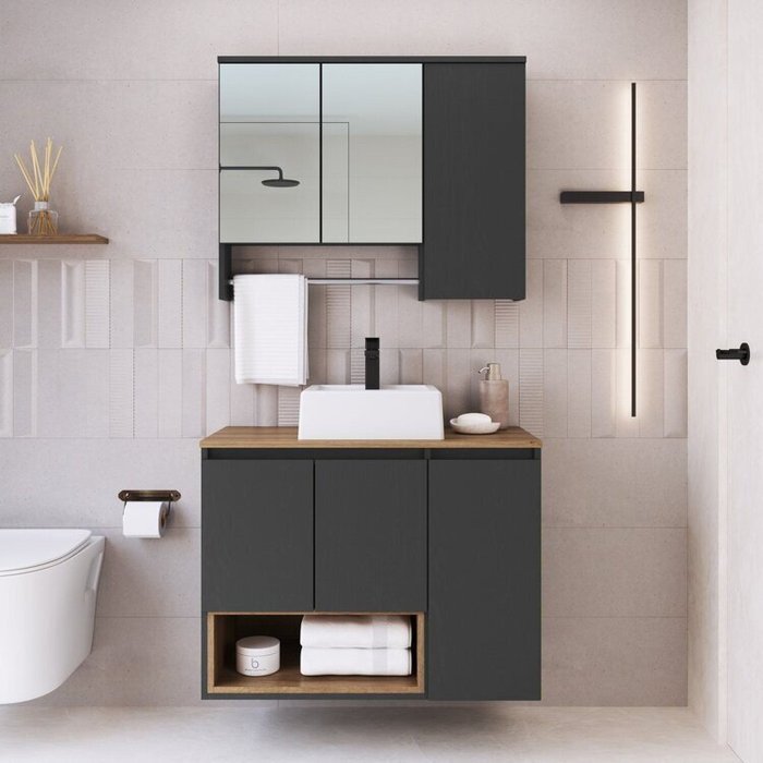 Conjunto para Gabinete Suspenso 80cm com Cuba e Espelheira 3 Portas com Toalheiro Olívia Mel/Grafite