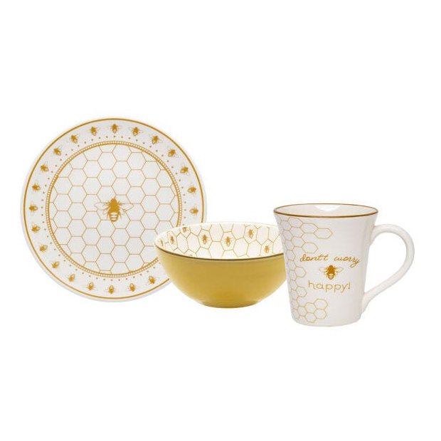 O conjunto de lanche composto por uma caneca, uma tigela e um prato de sobremesa traz características e uma colméia e abelha, nas cores amarelo e branco.