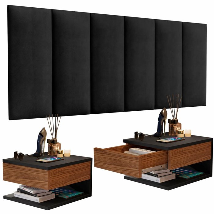 Conjunto Para Quarto Cabeceira Julia Casal 1,40 Preto com Duas Mesas de Cabeceira Suspensa Decor - Preto